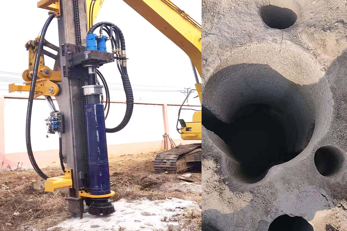 3. The working radius is enlarged. Because the excavator boom is not dismantled, its working radius can be extended by 2-3 meters, and the elevation angle drilling, horizontal drilling and vertical drilling can be realized;