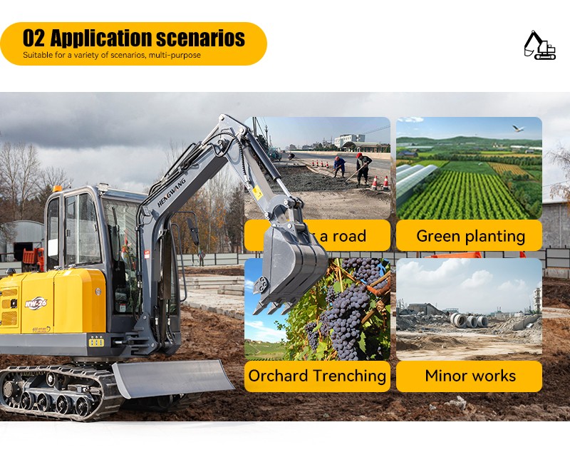 The HW-26 model stands out as the ideal choice for a variety of applications, from handling loose soil in greenhouses to landscaping work, planting, excavating in orchard nurseries, crushing concrete pavement, mixing sand and gravel, and construction operations in small spaces.